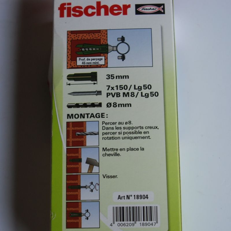 100 Chevilles en polypropylène D.8 PC 8 Spéciale patte à vis, fixation de collier FISCHER ref. 18904. Collerette supportée par des stries de blocage qui s’oppose à toute rotation de la cheville. Corps fendu qui permet un guidage de la vis. Extrémité arrondi de la cheville qui permet un enfoncement facile dans le forage.
