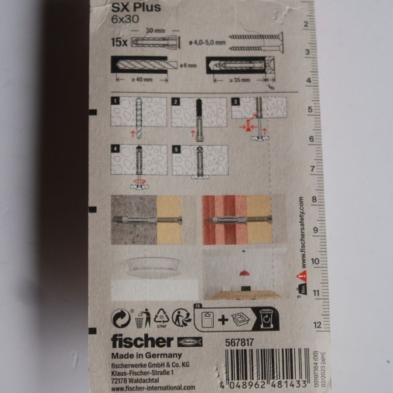 15 Chevilles à expansion en nylon SX plus 6 x 30 FISCHER ref. 567817. Quadruple expansion pour une charge optimale. La cheville s’installe sans effort. La collerette empêche la cheville de glisser dans le forage. Couple de serrage perceptible.