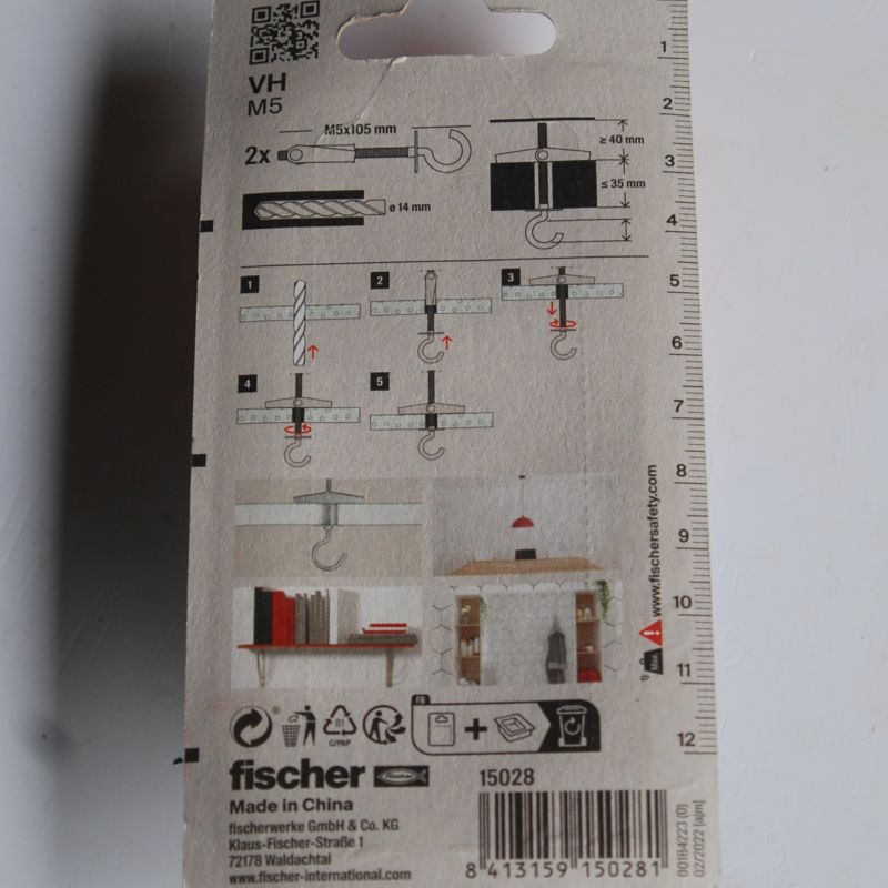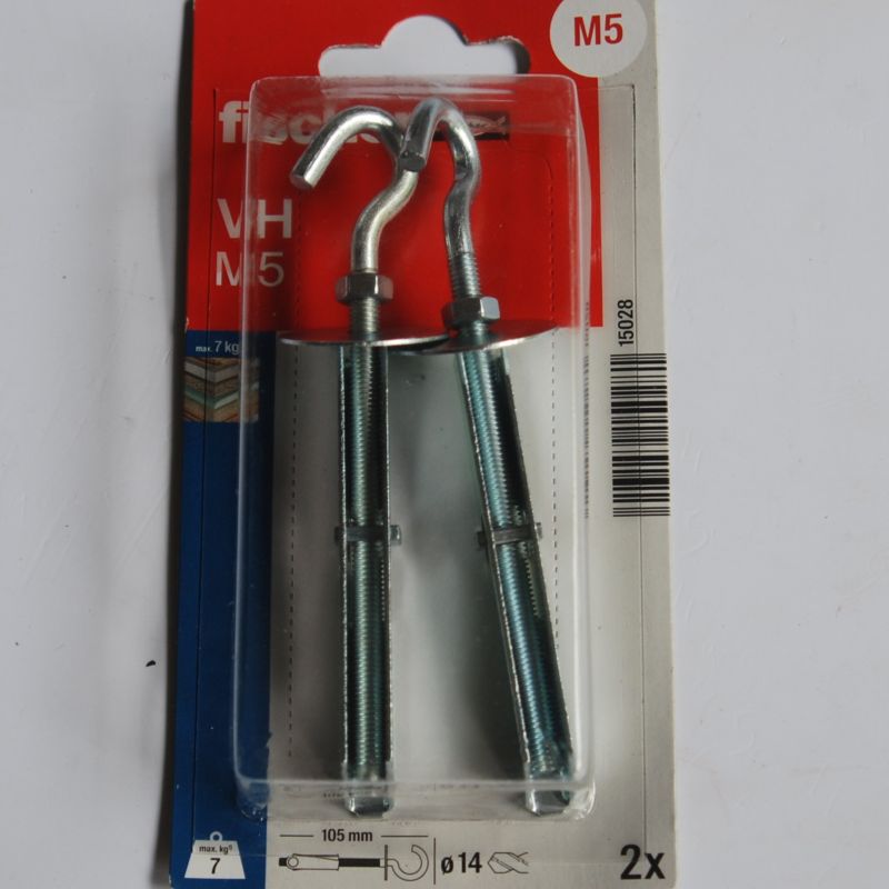 2 Chevilles à bascule VH M5 avec crochet rond FISCHER Ref. 15028. Charge max. 7 Kg. Résistance élevée grâce à la bonne répartition des charges sur les éléments porteurs. Montage simple grâce à l’ouverture automatique de l’élément ressort.. Flexibilité élevée grâce au filetage long. Utilisation avec différentes épaisseurs de panneaux et épaisseurs des éléments à fixer. Convient pour le montage en attente.