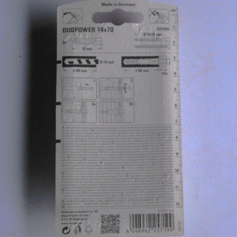 2 Chevilles bi-matière DuoPower 14 x 70 FISCHER ref. 537655. Association de deux matières pour davantage de performances. Fonctionnement sûr pour les matériaux pleins (expansion) et de construction creux et en panneaux (se déploie/noeud). Installation facile : la collerette étroite empêche la cheville de glisser dans le perçage.