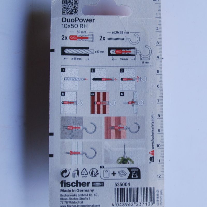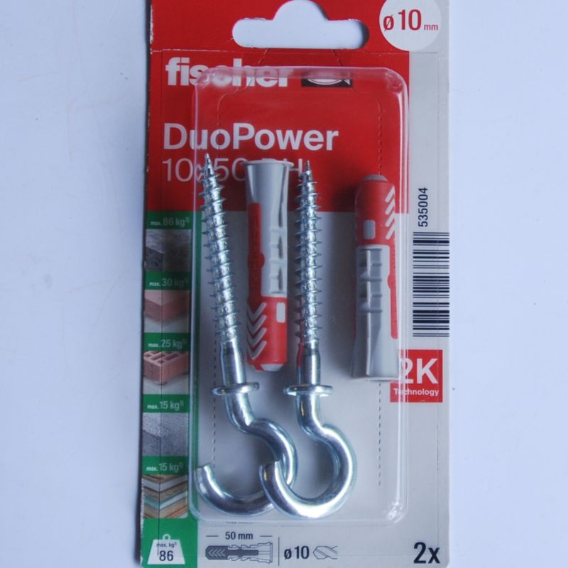 2 Chevilles tous matériaux DuoPower 10×50 RH avec crochet rond ref. 535004 FISCHER . Association de deux matières pour davantage de performances. Fonctionnement sûr pour les matériaux pleins (expansion) et de construction creux et en panneaux (se déploie/noeud). Installation facile : la collerette étroite empêche la cheville de glisser dans le perçage. Excellent feedback de la cheville – on sent précisément quand elle est correctement posée. Avec le crochet d’angle approprié pour une tenue parfaite.