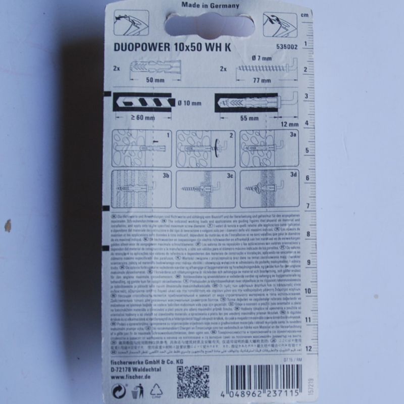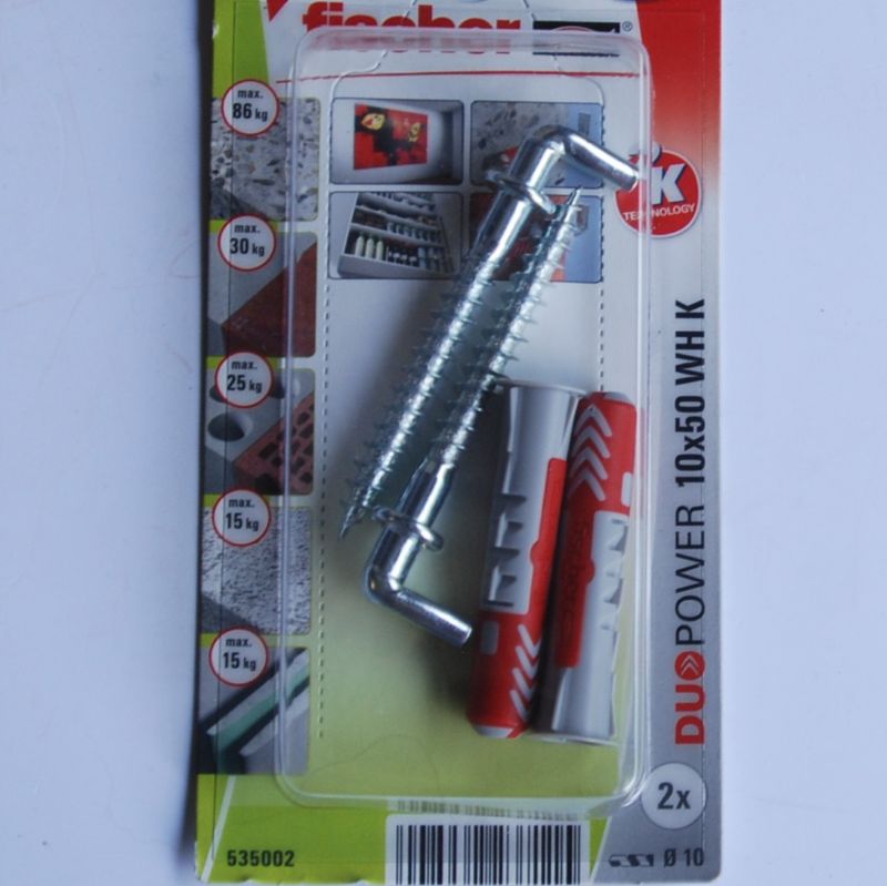 2 Chevilles tous matériaux DuoPower 10×50 WH avec crochet droit ref. 535002 FISCHER . Association de deux matières pour davantage de performances. Fonctionnement sûr pour les matériaux pleins (expansion) et de construction creux et en panneaux (se déploie/noeud). Installation facile : la collerette étroite empêche la cheville de glisser dans le perçage. Excellent feedback de la cheville – on sent précisément quand elle est correctement posée. Avec le crochet d’angle approprié pour une tenue parfaite.