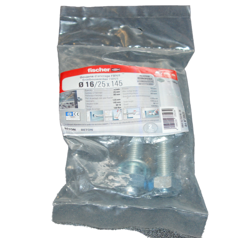 2 Goujons d’ancrage FBN II 16/25×145 FISCHER ref. 33523. Le FBN II atteint la résistance la plus élevée avec la profondeur d’ancrage standard. Ceci signifie moins de points de fixation et des platines plus petites. Si la profondeur d’ancrage réduite est utilisée, ceci diminue la profondeur de perçage et simplifie l’installation. Le filetage long permet les ajustements. De plus, le FBN II convient également pour les installations déportées. Ceci accroit la flexibilité. Montage simple grâce à un nombre réduit de coups de marteau et à un glissement minimal. La partie saillante de la tige filetée protège le filetage des dommages. Ceci permet de gagner du temps lors du montage et du démontage.
