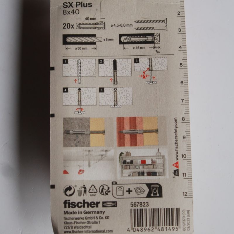 20 Chevilles à expansion en nylon SX plus 8 x 40 FISCHER ref. 567818. Quadruple expansion pour une charge optimale. La cheville s’installe sans effort. La collerette empêche la cheville de glisser dans le forage. Couple de serrage perceptible.
