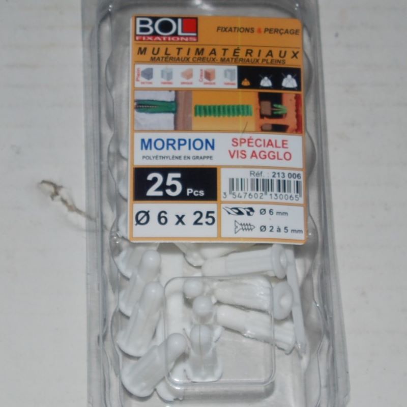 25 Chevilles Polyéthylène spéciale Vis Agglo D. 6x25mm. BOL-FIXATIONS ref. 213006. Pour matériaux creux ou pleins.