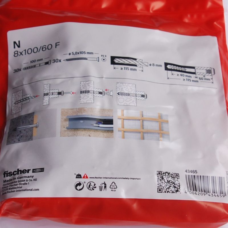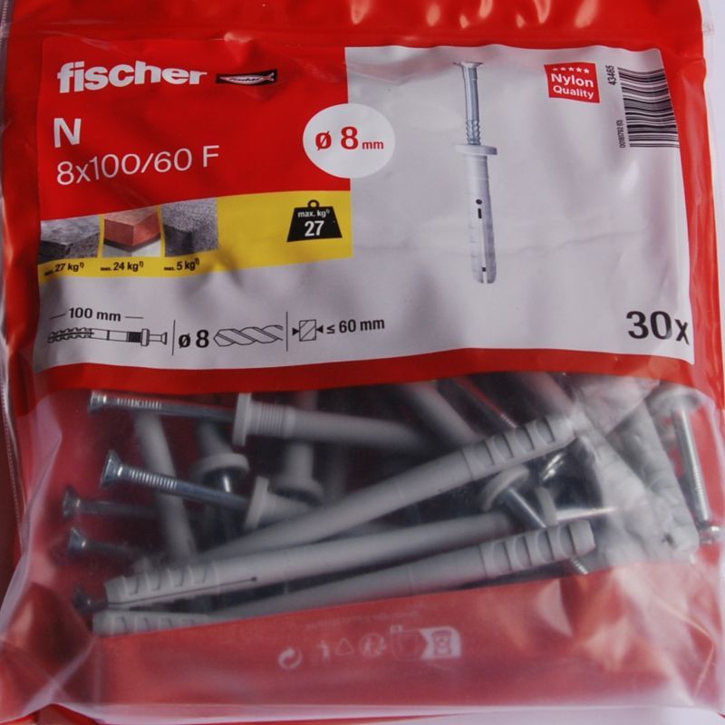 30 chevilles à frapper N 8 x 100/60 F FISCHER ref. 43465. Le montage rapide au marteau permet de gagner du temps : idéal pour les installations en série. Installation simple et sûre : la butée interne évite l’expansion prématurée de la cheville. Démontage ultérieur du clou possible grâce à l’empreinte cruciforme. Avec tête plate pour constructions métalliques.