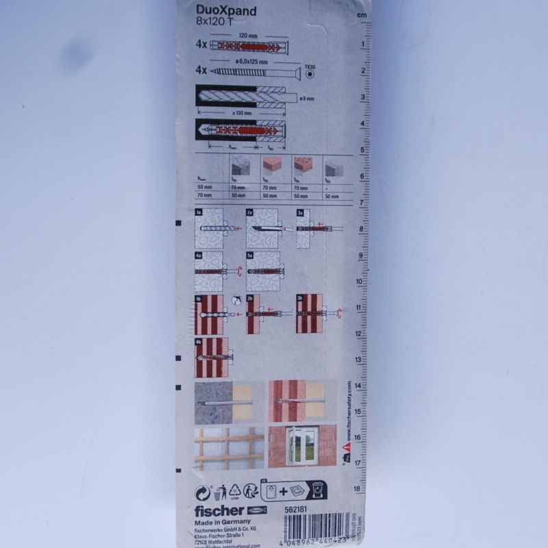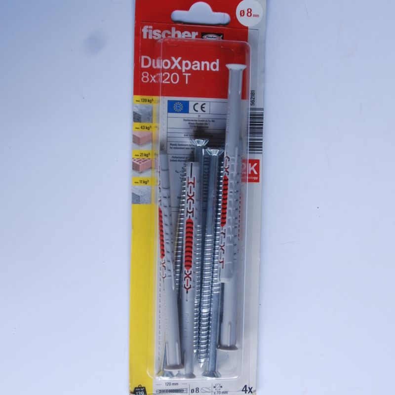 4 Chevilles rallongées DuoXpand 10 x 160 T en acier électrozingué Ref. 562189 FISCHER DAREX . Combinaison astucieuse entre conception et matières pour une installation sûre dans le matériau de construction. Élément d’expansion avec deux profondeurs d’ancrage pour une utilisation flexible. Fixation multiple agréée pour applications non structurelles dans le béton et la maçonnerie. Les ergots anti-rotation empêchent la cheville de tourner dans le trou lors de l’installation. Vis de sécurité à tête fraisée pré-montée.