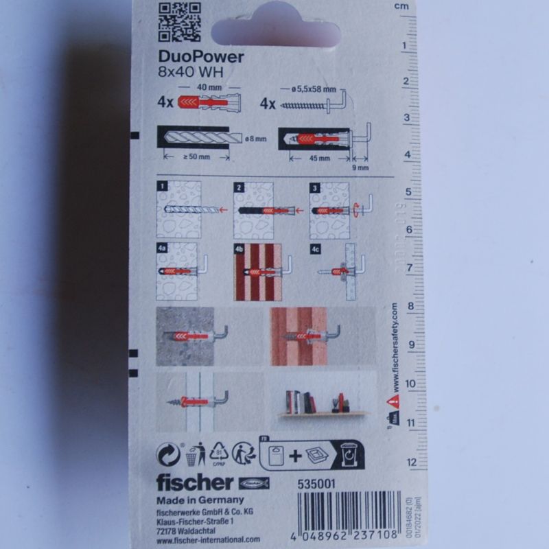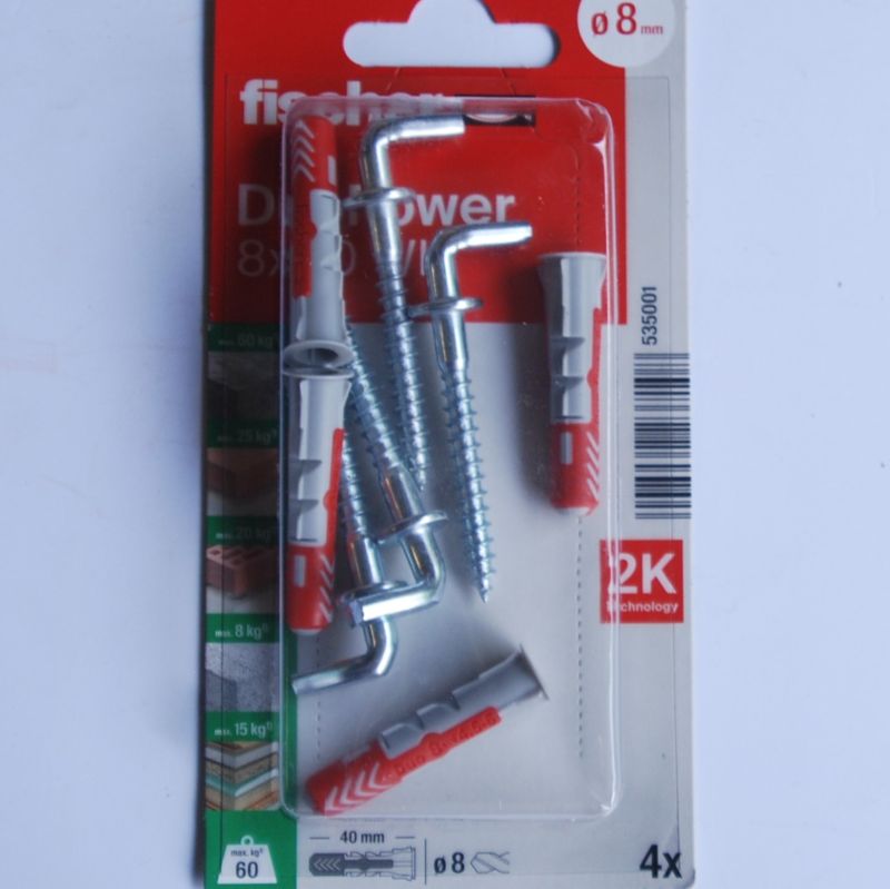 4 Chevilles tous matériaux DuoPower 8×40 WH avec crochet droit ref. 535001 FISCHER . Association de deux matières pour davantage de performances. Fonctionnement sûr pour les matériaux pleins (expansion) et de construction creux et en panneaux (se déploie/noeud). Installation facile : la collerette étroite empêche la cheville de glisser dans le perçage. Excellent feedback de la cheville – on sent précisément quand elle est correctement posée. Avec le crochet d’angle approprié pour une tenue parfaite.
