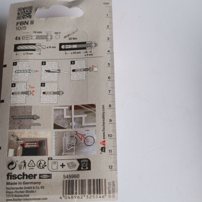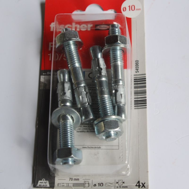 4 Goujons d’ancrage en acier électrozingué FBN II 10/5 D.10 x 70mm . FISCHER ref. 545960. Capacité de charge maximale dans le béton non fissuré, ce qui signifie moins de points de fixation et des platines plus petites. Montage simple grâce à un nombre réduit de coups de marteau et à un glissement minimal. La partie saillante de la tige filetée protège le filetage des dommages. Ceci permet de gagner du temps lors du montage et du démontage.