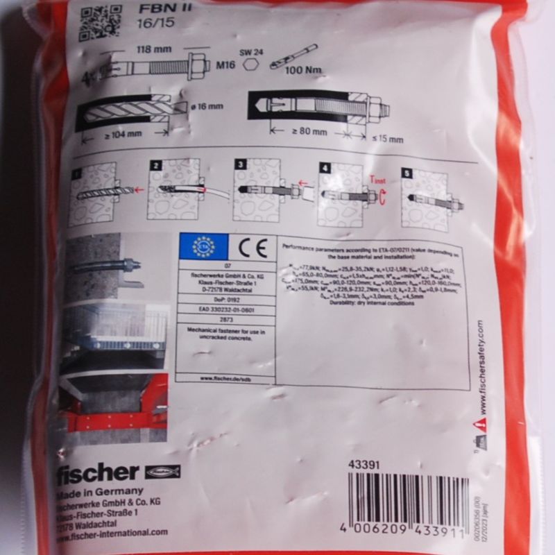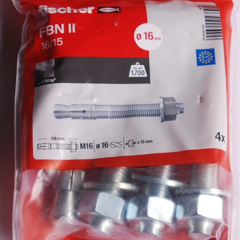 4 Goujons d’ancrage FBN II 16/15 D.16 x 118mm . FISCHER ref. 43391. Le FBN II atteint la résistance la plus élevée avec la profondeur d’ancrage standard. Ceci signifie moins de points de fixation et des platines plus petites. Si la profondeur d’ancrage réduite est utilisée, ceci diminue la profondeur de perçage et simplifie l’installation. Le filetage long permet les ajustements. De plus, le FBN II convient également pour les installations déportées. Ceci accroit la flexibilité. Montage simple grâce à un nombre réduit de coups de marteau et à un glissement minimal. Acier inoxydable : sécurité durable pour les utilisations à l’extérieur.