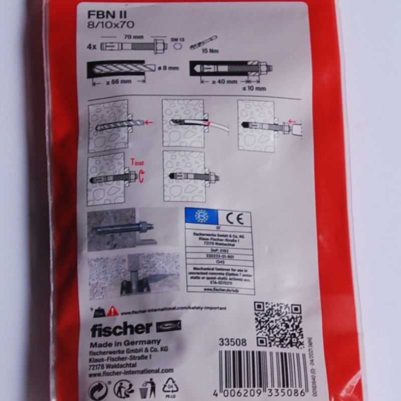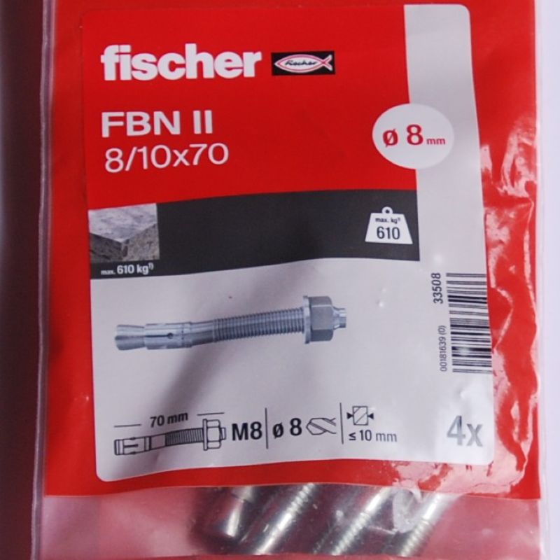 4 Goujons d’ancrage FBN II 8/10 D.8 x 70mm . FISCHER ref. 33508. Le FBN II atteint la résistance la plus élevée avec la profondeur d’ancrage standard. Ceci signifie moins de points de fixation et des platines plus petites. Si la profondeur d’ancrage réduite est utilisée, ceci diminue la profondeur de perçage et simplifie l’installation. Le filetage long permet les ajustements. De plus, le FBN II convient également pour les installations déportées. Ceci accroit la flexibilité. Montage simple grâce à un nombre réduit de coups de marteau et à un glissement minimal. Acier inoxydable : sécurité durable pour les utilisations à l’extérieur.