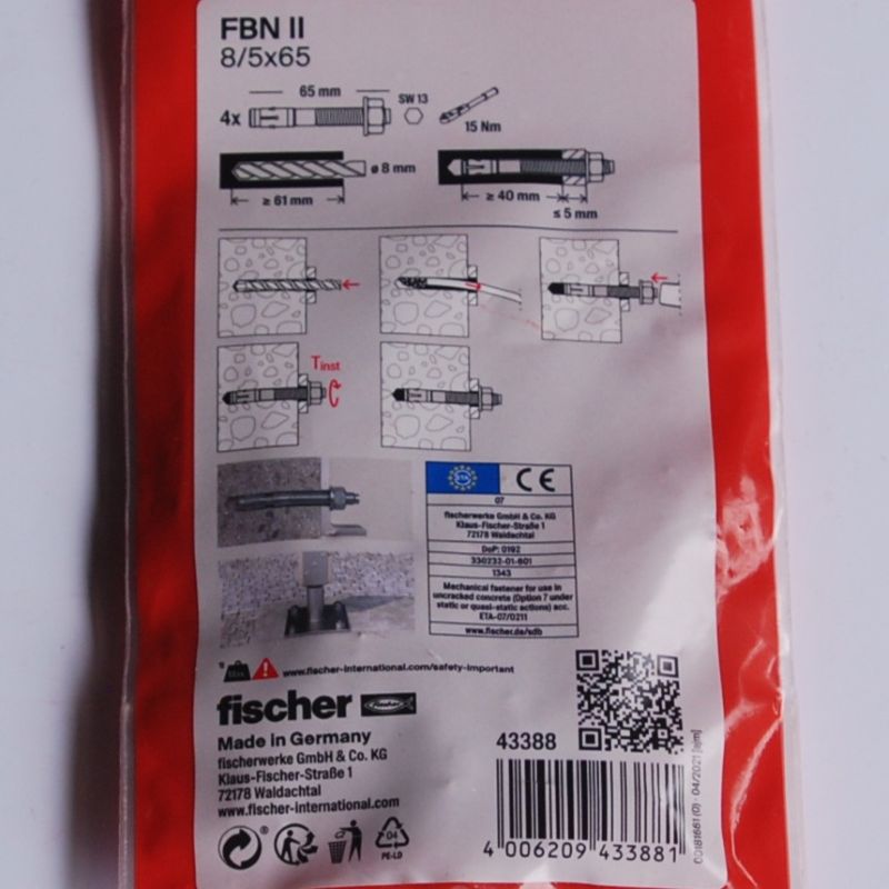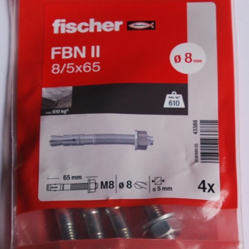 4 Goujons d’ancrage FBN II 8/5 D.8 x 65mm . FISCHER ref. 43388. Le FBN II atteint la résistance la plus élevée avec la profondeur d’ancrage standard. Ceci signifie moins de points de fixation et des platines plus petites. Si la profondeur d’ancrage réduite est utilisée, ceci diminue la profondeur de perçage et simplifie l’installation. Le filetage long permet les ajustements. De plus, le FBN II convient également pour les installations déportées. Ceci accroit la flexibilité. Montage simple grâce à un nombre réduit de coups de marteau et à un glissement minimal. Acier inoxydable : sécurité durable pour les utilisations à l’extérieur.
