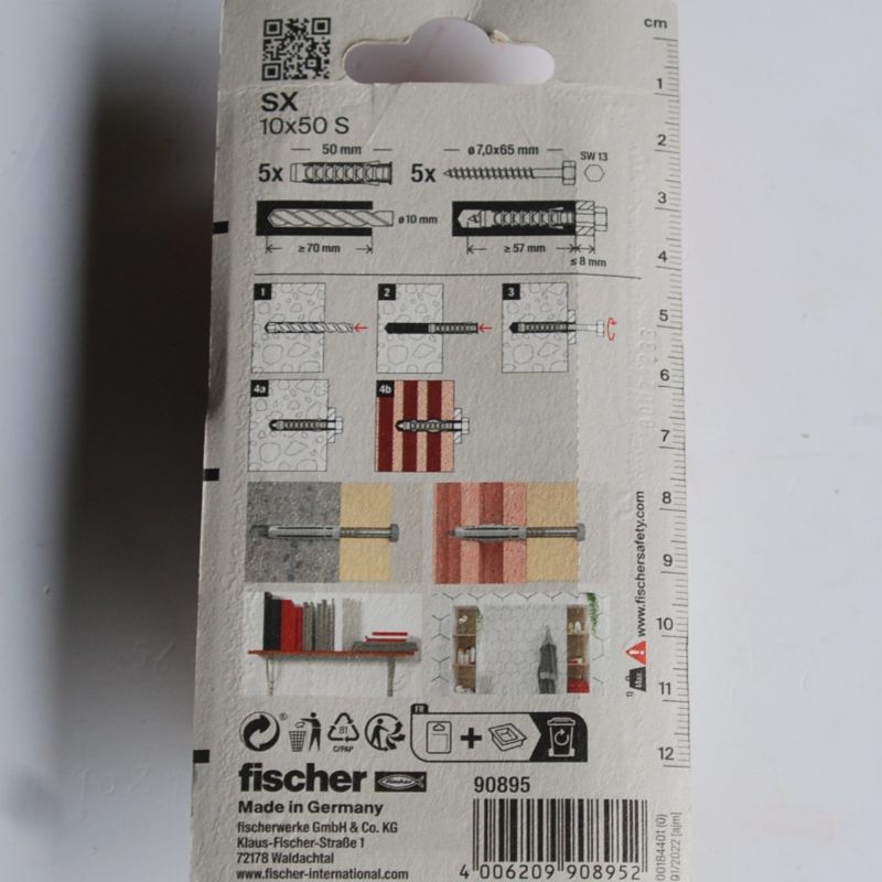 5 Chevilles à expansion en nylon SX 10 x 50 avec vis FISCHER ref. 90895. Transmission optimale des forces grâce à la quadruple expansion. Ceci permet des charges élevées dans les matériaux de construction pleins et creux.Installation simple : la collerette empêche la cheville de glisser dans le perçage. Pas de contraintes d’expansion sous la tête de la cheville. Les carrelages et enduits ne sont pas abîmés. Avec la vis adaptée pour une épaisseur maximale de pièce à fixer de 20 mm.