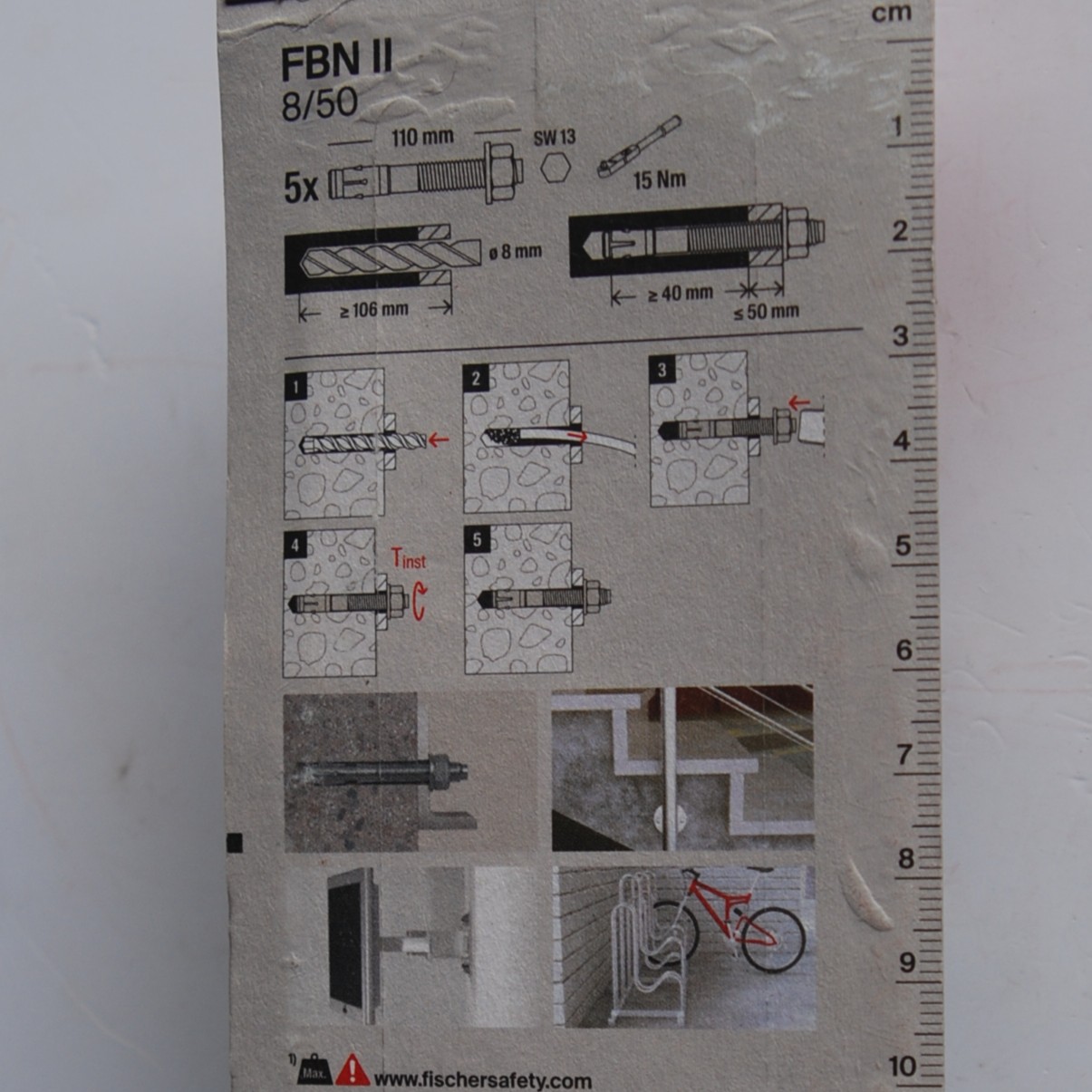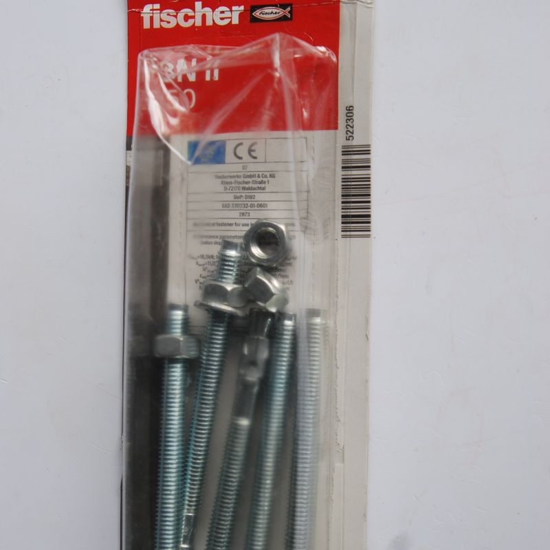 5 Goujons d’ancrage en acier électrozingué FBN II 8/50 D.8 x 110mm . FISCHER ref. 522306. Capacité de charge maximale dans le béton non fissuré, ce qui signifie moins de points de fixation et des platines plus petites. Montage simple grâce à un nombre réduit de coups de marteau et à un glissement minimal. La partie saillante de la tige filetée protège le filetage des dommages. Ceci permet de gagner du temps lors du montage et du démontage.