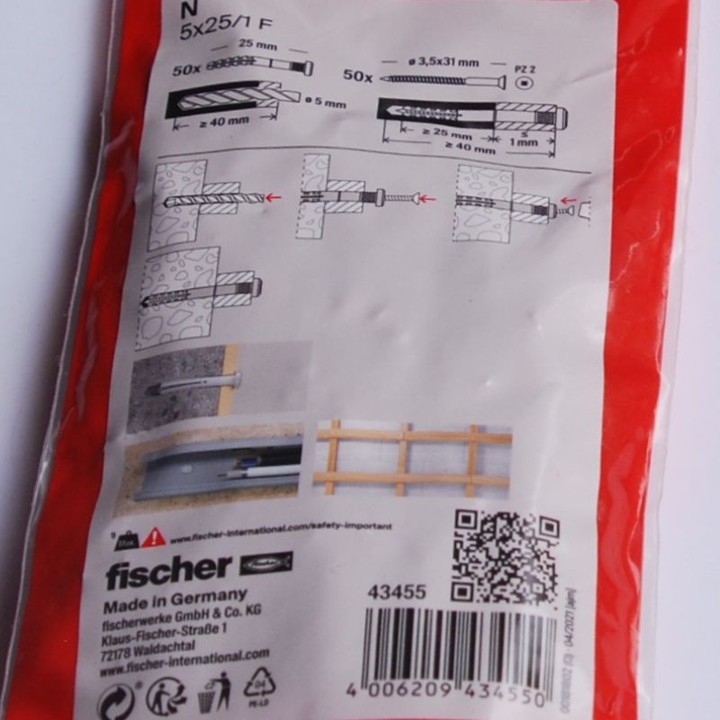 50 chevilles à frapper N 5 x 25/1 F FISCHER ref. 43455. Le montage rapide au marteau permet de gagner du temps : idéal pour les installations en série. Installation simple et sûre : la butée interne évite l’expansion prématurée de la cheville. Démontage ultérieur du clou possible grâce à l’empreinte cruciforme. Avec tête plate pour constructions métalliques.