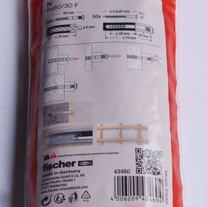 50 chevilles à frapper N 6 x 60/30 F FISCHER ref. 43460. Le montage rapide au marteau permet de gagner du temps : idéal pour les installations en série. Installation simple et sûre : la butée interne évite l’expansion prématurée de la cheville. Démontage ultérieur du clou possible grâce à l’empreinte cruciforme. Avec tête plate pour constructions métalliques.