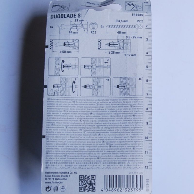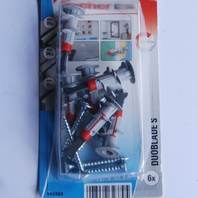 6 Chevilles autoforeuse pour plaques de carton plâtre DuoBlade S K NV avec visFISCHER ref. 545684. Cheville autoforeuse pour plaques de carton plâtre pour un montage facile et rapide. Lame de centrage pour un positionnement précis de la cheville Ergots anti-rotation empêchant la cheville de tourner dans le forage. Empreinte cruciforme PZ2 : 1 seul et même embout pour la cheville et la vis facilitant ainsi le montage Tenue optimale avec la vis à bois aggloméré adaptée.