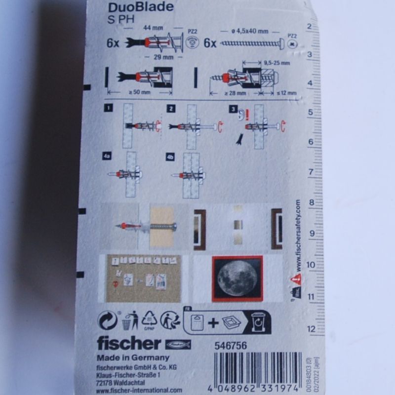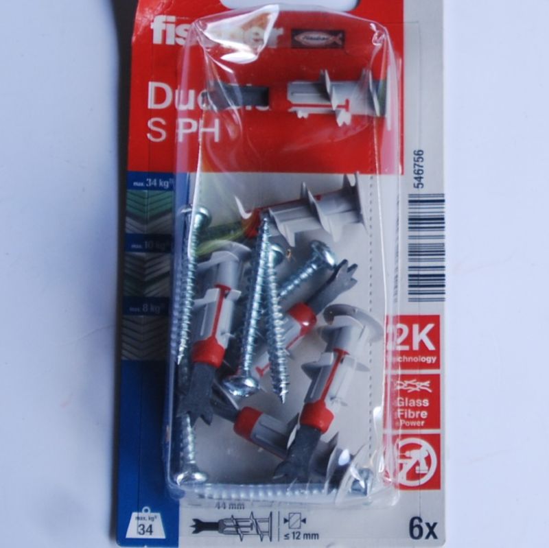6 Chevilles autoforeuse pour plaques de carton plâtre DuoBlade S PH K NV avec vis tête ronde FISCHER ref. 546756. Cheville autoforeuse pour plaques de carton plâtre pour un montage facile et rapide. Lame de centrage pour un positionnement précis de la cheville. Ergots anti-rotation empêchant la cheville de tourner dans le forage. Empreinte cruciforme PZ2 : 1 seul et même embout pour la cheville et la vis facilitant ainsi le montage
