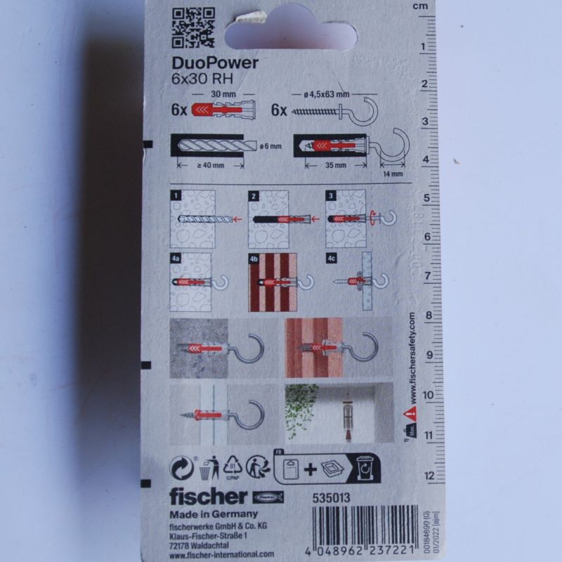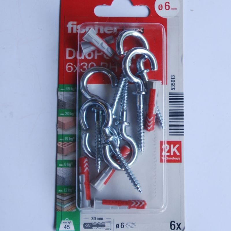 6 Chevilles tous matériaux DuoPower 10×50 RH avec crochet rond ref. 535004 FISCHER . Association de deux matières pour davantage de performances. Fonctionnement sûr pour les matériaux pleins (expansion) et de construction creux et en panneaux (se déploie/noeud). Installation facile : la collerette étroite empêche la cheville de glisser dans le perçage. Excellent feedback de la cheville – on sent précisément quand elle est correctement posée. Avec le crochet d’angle approprié pour une tenue parfaite.