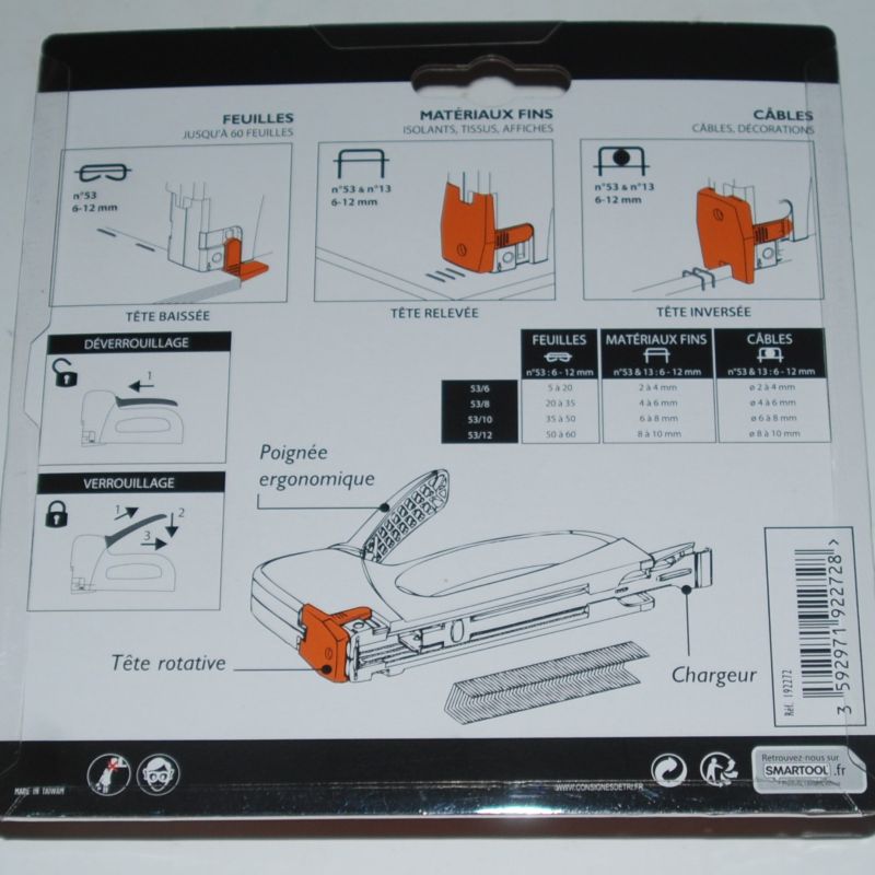 Agrafeuse 3 en 1 à tête rotative SMARTOOL Réf. 192272. Permet d’agrafer des feuilles, des matériaux fins et des câbles.