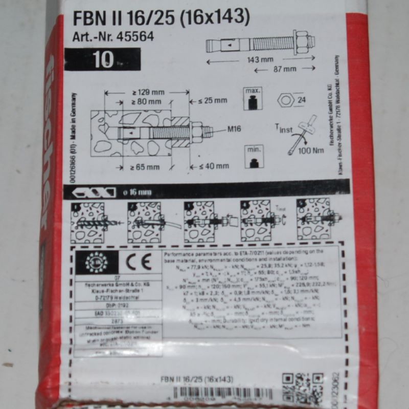 Boite de 10 goujons d’ancrages FBN II 16×143 mm en acier électrozingué FISCHER ref. 45564