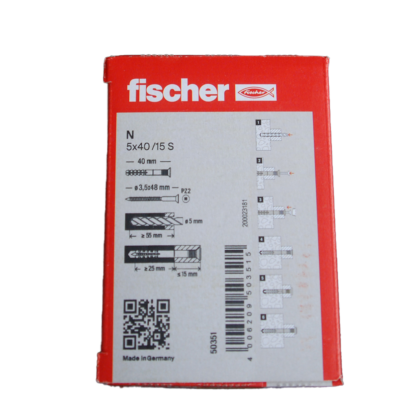 Boite de 100 chevilles à frapper N 5 x 40/15 S avec collerette fraisée et clou en acier électrozingué FISCHER ref. 50351. Le montage rapide au marteau permet de gagner du temps : idéal pour les installations en série. Installation simple et sûre : la butée interne évite l’expansion prématurée de la cheville. Démontage ultérieur du clou possible grâce à l’empreinte cruciforme. Avec tête fraisée.