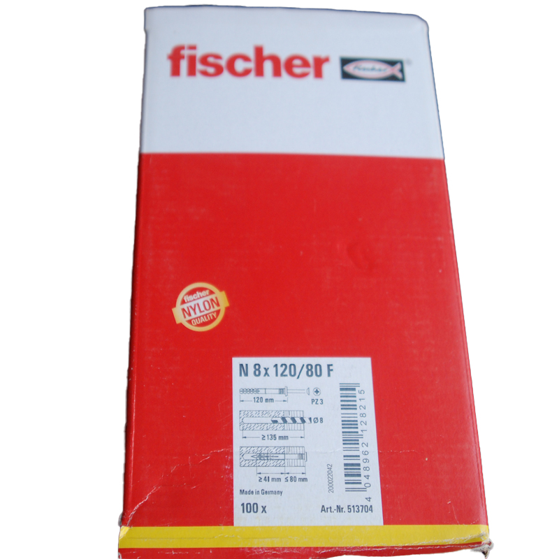 Boite de 100 chevilles à frapper N 8 x 120/80 F avec collerette épaisse et clou tête fraisée FISCHER ref. 513704. Le montage rapide au marteau permet de gagner du temps : idéal pour les installations en série. Installation simple et sûre : la butée interne évite l’expansion prématurée de la cheville. Démontage ultérieur du clou possible grâce à l’empreinte cruciforme. Avec tête plate pour constructions métalliques.