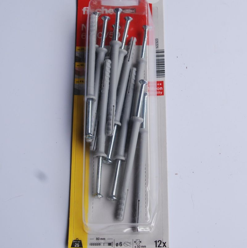 Boite de 12 chevilles à frapper N 6 x 80 S avec vis à tête fraisée FISCHER ref. 522323. Le montage rapide au marteau permet de gagner du temps : idéal pour les installations en série. Installation simple et sûre : la butée interne évite l’expansion prématurée de la cheville. Démontage ultérieur du clou possible grâce à l’empreinte cruciforme.