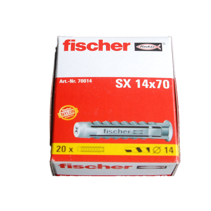 Boite de 20 chevilles à expansion en nylon SX 14 x 70 FISCHER ref. 70014. Fixation en nylon à expansion. Peut être utilisée avec des vis à bois, des vis pour panneau d’aggloméré, des vis auto-perceuse et des vis de montage à distance. Résiste à des températures comprises entre – 40 et + 80 °C. La forme de la cheville autorise l’utilisation de vis à bois et de vis pour panneau d’aggloméré de 2 à 12 mm. La quadruple expansion garantit une résistance optimale. Les ergots anti-rotation empêchent la fixation de tourner dans le trou percé. La partie lisse sous tête ne s’expanse pas et évite d’endommager le carrelage et le plâtre. Installation traversante rapide et simple, qui réduit le temps de mise en ‘uvre. La butée interne permet un montage traversant à l’aide de vis pré-assemblées. La collerette de la cheville l’empêche de glisser plus profondément dans le trou percé. Pour fixation dans le béton, béton cellulaire, briques plaines, parpaings creux, fibrociment. Permet de fixer tableaux, détecteurs de mouvement, lampes, plinthes, interrupteurs électriques, étagères murales légères, porte-serviettes, armoires de toilette, boîtes aux lettres, suspensions florales, tringles à rideaux.