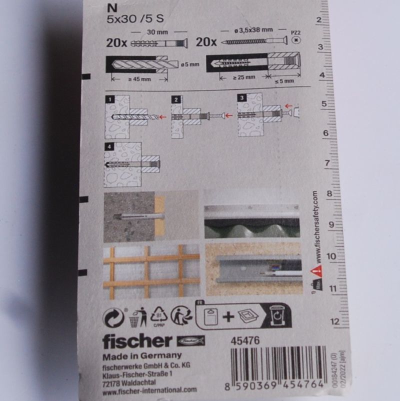 Boite de 20 chevilles à frapper N 5 x 30/5 S gvz FISCHER ref. 45476. Le montage rapide au marteau permet de gagner du temps : idéal pour les installations en série. Installation simple et sûre : la butée interne évite l’expansion prématurée de la cheville. Démontage ultérieur du clou possible grâce à l’empreinte cruciforme. Avec tête fraisée.