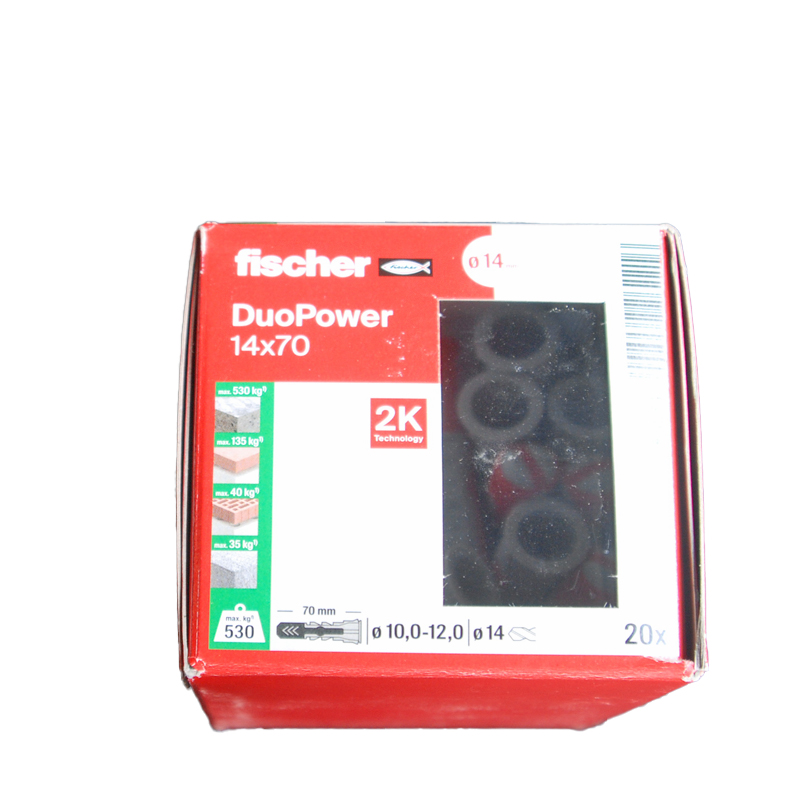 Boite de 20 chevilles bi-matière DuoPower 14 x 70 FISCHER ref. 538254. Association de deux matières pour davantage de performances. Fonctionnement sûr pour les matériaux pleins (expansion) et de construction creux et en panneaux (se déploie/noeud). Installation facile : la collerette étroite empêche la cheville de glisser dans le perçage.