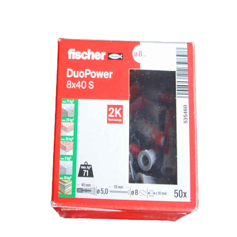 Boite de 50 chevilles bi-matière avec vis DuoPower 8 x 40 S FISCHER ref. 535460. Association de deux matières pour davantage de performances. Fonctionnement sûr pour les matériaux pleins (expansion) et de construction creux et en panneaux (se déploie/noeud). Installation facile : la collerette étroite empêche la cheville de glisser dans le perçage.