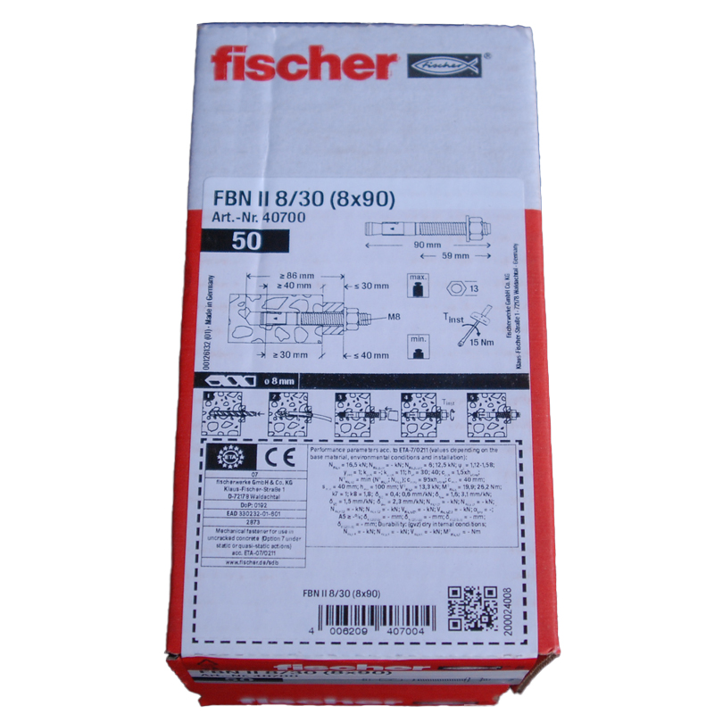 Boite de 50 goujons d’ancrages FBN II 8x90mm  en acier électrozingué FISCHER ref. 40700. Le FBN II atteint la résistance la plus élevée avec la profondeur d’ancrage standard. Ceci signifie moins de points de fixation et des platines plus petites. Si la profondeur d’ancrage réduite est utilisée, ceci diminue la profondeur de perçage et simplifie l’installation. Le filetage long permet les ajustements. De plus, le FBN II convient également pour les installations déportées. Ceci accroit la flexibilité. Montage simple grâce à un nombre réduit de coups de marteau et à un glissement minimal. La partie saillante de la tige filetée protège le filetage des dommages. Ceci permet de gagner du temps lors du montage et du démontage.
