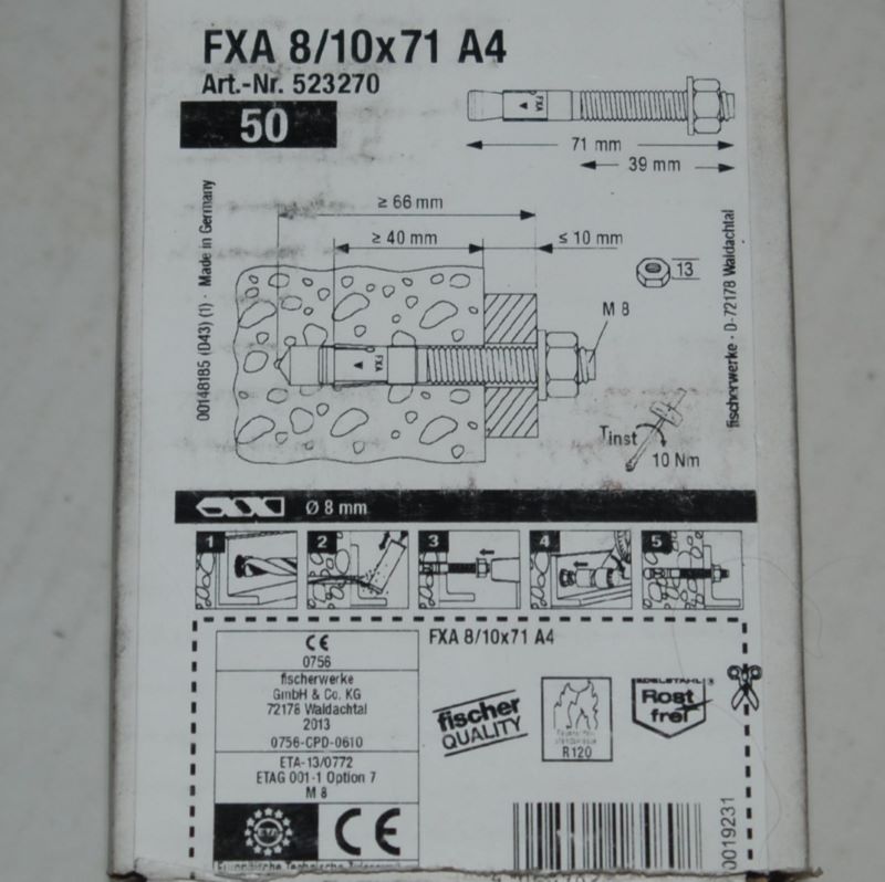 Boite de 50 goujons d’ancrages FXA 8 x 71mm. Inox A4 FISCHER ref. 523270.