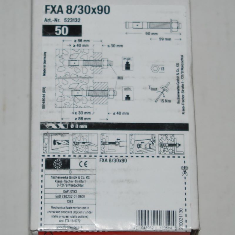 Boite de 50 goujons d’ancrages FXA 8 x 90mm. FISCHER ref. 523132.