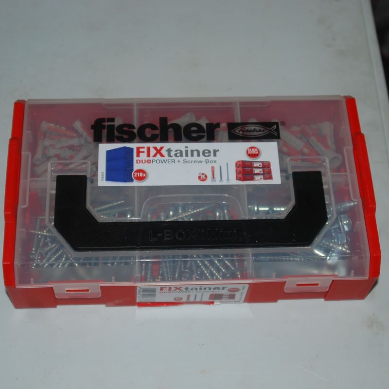 FIXtainer coffret de 210 pièces 105 chevilles bi-matière avec vis DuoPower D.6/8/10 FISCHER ref. 536162. 60 Chevilles 6x30mm., 30 Chevilles 8x40mm. 15 Chevilles 10x50mm. Avec les vis assorties. Les coffrets FixTainer se clipsent entre eux, pour un transport facile. Couvercle transparent avec poignée intégré : contenu visible en un coup d’oeil et facile à transporter. Coffret de haute qualité refermable et rechargeable. Séparateurs amovibles : flexibilité et agencement du coffret selon ses besoins. DuoPower – La cheville intelligente bi-matière dotée de trois fonctions (s’expanse, se déploie, forme un noeud) permet une variété d’applications avec une seule cheville.