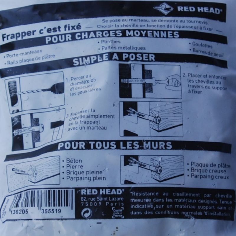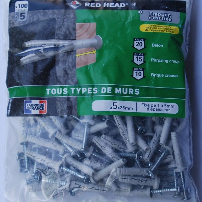 Sachet de 100 chevilles à frapper 5 x 25mm. avec vis RED HEAD ref. F525A100