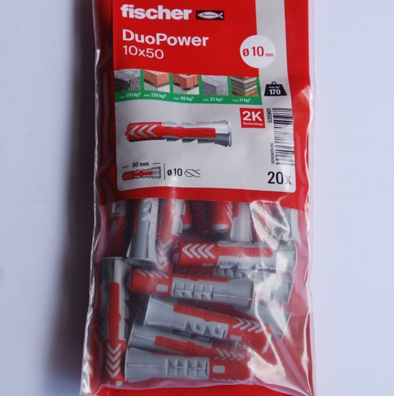 Sachet de 20 chevilles bi-matière DuoPower 10 x 50mm. FISCHER ref. 535901. Association de deux matières pour davantage de performances. Fonctionnement sûr pour les matériaux pleins (expansion) et de construction creux et en panneaux (se déploie/noeud). Installation facile : la collerette étroite empêche la cheville de glisser dans le perçage.
