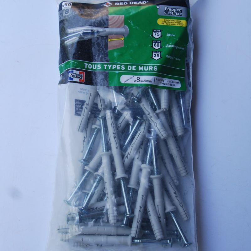 Sachet de 6 chevilles nylon 12 x 120mm. avec tirefonds 12x135mm. RED HEAD ref. B12120SA6. Pour tous types de murs.