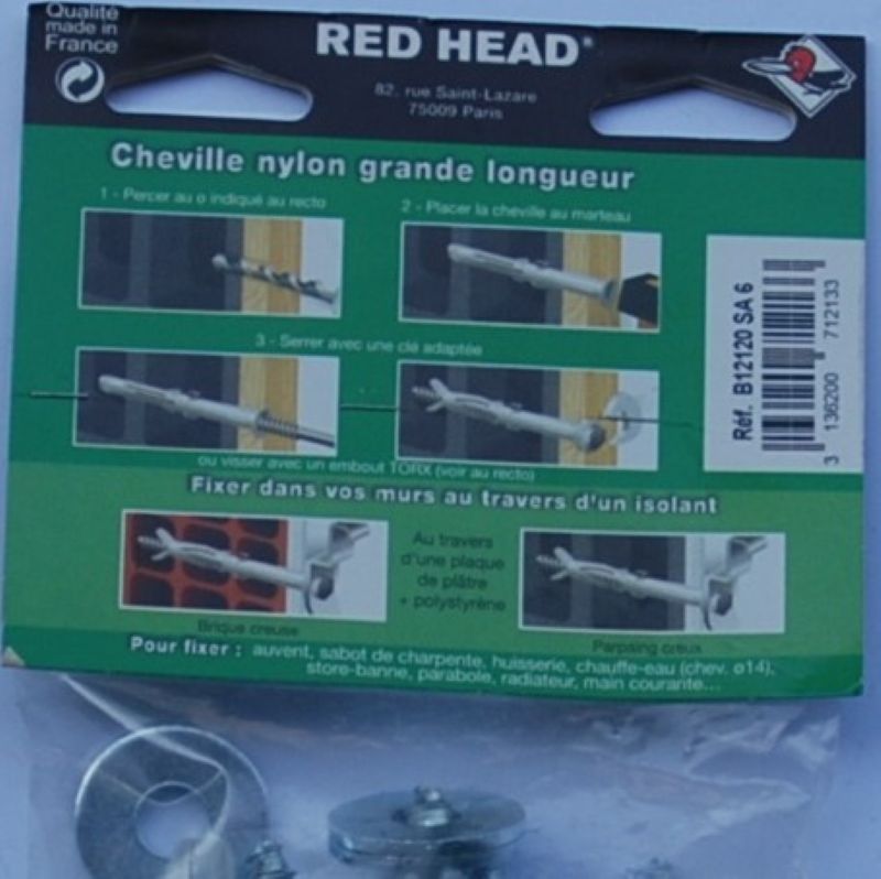 Sachet de 6 chevilles nylon 12 x 120mm. avec tirefonds 12x135mm. RED HEAD ref. B12120SA6